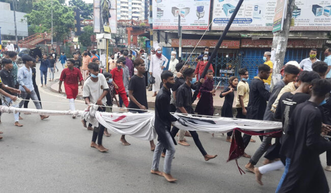 অধিকার ডেস্ক :: পবিত্র আশুরা উপলক্ষে প্রতিবছর রাজধানীতে শিয়া সম্প্রদায়ের উদ্যোগে তাজিয়া মিছিল বের হয়েছে। তবে এবার করোনা পরিস্থিতির কারণে তাজিয়া মিছিল বন্ধ ঘোষণা করা হয়। তারপরও নিষেধাজ্ঞার মধ্যেই ঢাকা মেট্রোপলিটন পুলিশের (ডিএমপি) অনুমতি ছাড়াই রাস্তায় মিছিল বের করতে দেখা গেছে।