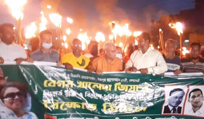 বিএনপি চেয়ারপারসন খালেদা জিয়ার মুক্তি এবং গ্যাস-বিদ্যুৎ ও পানির দাম বাড়ানোর প্রতিবাদে এ মশাল মিছিল করা হয়।