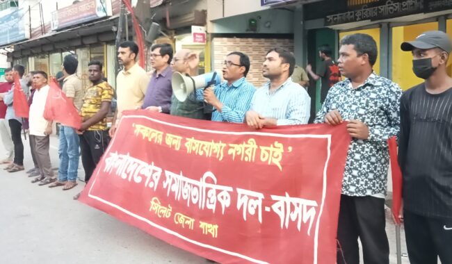 বুধবার (২৭ আগস্ট) বিকেল সাড়ে পাঁচটায় আম্বরখানা দলীয় কার্যালয়ের সামনে সিলেট জেলা বাসদ আহ্বায়ক আবু জাফর এর সভাপতিত্বে ও জেলা সদস্য সচিব প্রণব জ্যোতি পাল এর সঞ্চালনায় মানববন্ধনে অন্যান্যের মধ্যে উপস্থিত ছিলেন ও বক্তব্য রাখেন বাসদ সিলেট সাবেক আহ্বায়ক উজ্জ্বল রায়, চারণ সাংস্কৃতিক কেন্দ্রের আহ্বায়ক নাজিকুল ইসলাম রানা, বাসদ নেতা এম এ ওয়াদুদ, সমাজতান্ত্রিক শ্রমিক ফ্রন্ট এর মনজুর আহমদ,সিমান্ত রায়, জাহেদ আহমদ, সংগ্রাম পরিষদের আবুল খায়ের, আলতাফ হোসেন, মাহফুজ আহমেদ প্রমূখ।